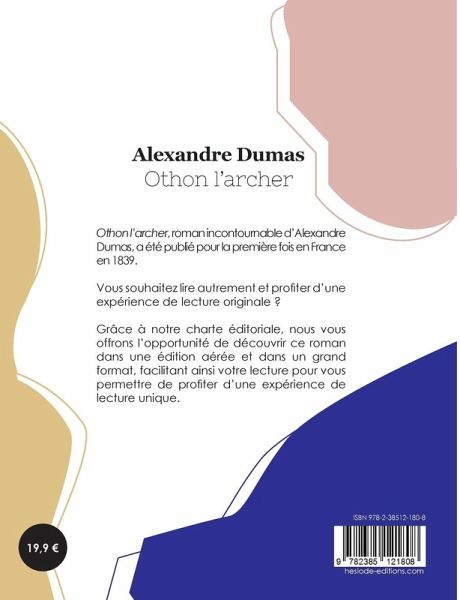 Othon l'archer, roman incontournable d'Alexandre Dumas, a été publié pour la première fois en France en 1839. Vous souhaitez lire autrement et profiter d¿une expérience de lecture originale ? Grâce à notre charte éditoriale, nous vous offrons l¿opportunité de découvrir cette nouvelle dans une édition aérée et dans un grand format, facilitant ainsi votre lecture pour vous permettre de profiter d¿une expérience de lecture unique.