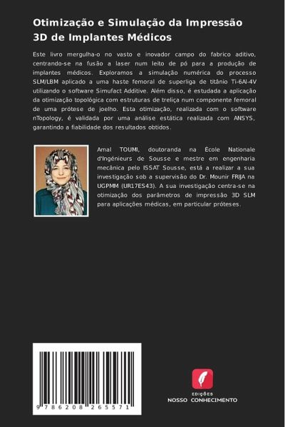 Este livro mergulha-o no vasto e inovador campo do fabrico aditivo, centrando-se na fusão a laser num leito de pó para a produção de implantes médicos. Exploramos a simulação numérica do processo SLM/LBM aplicado a uma haste femoral de superliga de titânio Ti-6Al-4V utilizando o software Simufact Additive. Além disso, é estudada a aplicação da otimização topológica com estruturas de treliça num componente femoral de uma prótese de joelho. Esta otimização, realizada com o software nTopology, é validada por uma análise estática realizada com ANSYS, garantindo a fiabilidade dos resultados obtidos.