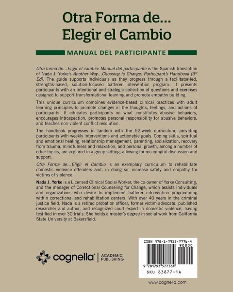 Otra forma de...Eligir el cambio: Manual del participante is the Spanish translation of Nada J. Yorke's Another Way...Choosing to Change: Participant's Handbook (3rd Ed). The guide supports individuals as they progress through a facilitator-led, strengths-based, solution-focused batterer intervention program. It presents participants with an intentional and strategic collection of questions and exercises designed to support transformational learning and promote empathy building. This unique curriculum combines evidence-based clinical practices with adult learning principles to promote changes in the thoughts, feelings, and actions of participants. It educates participants on what constitutes abusive behaviors, encourages introspection, promotes personal responsibility for abusive behaviors, and teaches non-violent conflict resolution. The handbook progresses in tandem with the 52-week curriculum, providing participants with weekly interventions and actionable goals. Coping skills, spiritual and emotional healing, relationship management, parenting, socialization, recovery from trauma, mindfulness and relaxation, and personal growth, among a number of other topics, are explored in a group setting, allowing for meaningful discussion and support. Otra Forma de...Eligir el Cambio is an exemplary curriculum to rehabilitate domestic violence offenders and, in doing so, increase safety and empathy for victims of violence.