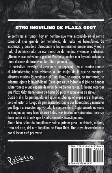 Otro inquilino de Plaza Odot Se confirma el rumor: hay un hombre que vive escondido en el centro comercial más grande del hemisferio, de todos los hemisferios. Su existencia y paradero obsesionan a los mismísimos propietarios y sobre todo al Administrador de ese monstruo de tiendas, viviendas y oficinas. ¿Quién es ese individuo o grupo? Pronto se vuelve una leyenda urbana y toma decenas de formas en la cultura popular. Un periodista investiga el caso para un reportaje. En el camino conoce al Administrador, a su asistente, a una mujer de la que se enamora. Mientras muchos lo persiguen el "inquilino" se escapa, se transmuta, se adentra, ejerce la invisibilidad. Dicen que es un ladrón o el jefe de bandas subterráneas o una especie de ninja de los bienes raíces. Es bueno recordar que Plaza Odot tiene torres de hasta 80 pisos y subniveles de siete. Quizá ni él ni los perseguidores lleguen a saber quién o qué era el Inquilino, pero el lector sí. Luego de persecuciones, uno o dos homicidios y mensajes que llegan al receptor equivocado, lo comprenderá. Seguramente no como lo imaginaba, muy lejos de casi todas esas teorías conspiratorias, pero sin duda sabrá de él más que los obsesionados investigadores. Ahora bien, saber del Inquilino es solo el primer paso. La historia, al final, trata del otro, del otro inquilino de Plaza Odot. Uno cuyo descubrimiento por el lector está por verse.