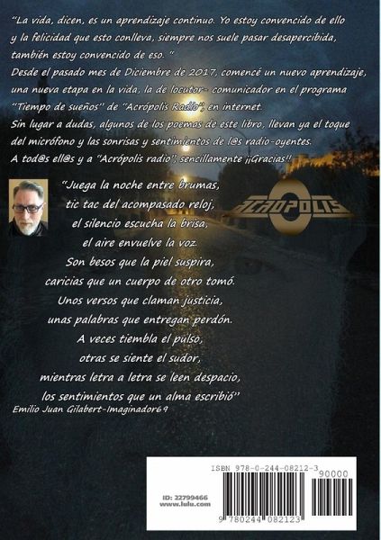 "La vida, dicen, es un aprendizaje continuo. Yo estoy convencido de ello y la felicidad que esto conlleva, siempre nos suele pasar desapercibida, también estoy convencido de eso. " Desde el pasado mes de Diciembre de 2017, comencé un nuevo aprendizaje, una nueva etapa en la vida, la de locutor- comunicador en el programa "Tiempo de sueños" de "Acrópolis Radio", en internet. Sin lugar a dudas, algunos de los poemas de este libro, llevan ya el toque del micrófono y las sonrisas y sentimientos de l@s radio-oyentes.