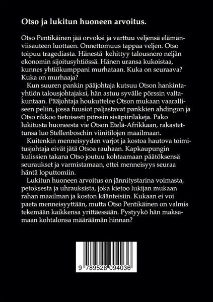 Otso Pentikäinen jää orvoksi ja varttuu veljensä elämän- viisauteen luottaen. Onnettomuus tappaa veljen. Otso toipuu tragediasta. Hänestä kehittyy talousnero neljän ekonomin sijoitusyhtiössä. Hänen uransa kukoistaa, kunnes yhtiökumppani murhataan. Kuka on seuraava? Kuka on murhaaja? Kun suuren pankin pääjohtaja kutsuu Otson hankinta- yhtiön talousjohtajaksi, hän astuu syvälle pörssin valta- kuntaan. Pääjohtaja houkuttelee Otson mukaan vaaralli- seen peliin, jossa fuusiot paljastavat pankkien ahdingon ja Otso rikkoo tietoisesti pörssin sisäpiirilakeja. Pako lukitusta huoneesta vie Otson Etelä-Afrikkaan, rakastet- tunsa luo Stellenboschin viinitilojen maailmaan. Kuitenkin menneisyyden varjot ja kostoa hautova toimi- tusjohtaja eivät jätä Otsoa rauhaan. Kapkaupungin kulissien takana Otso joutuu kohtaamaan päätöksensä seuraukset ja varmistamaan, ettei menneisyys seuraa häntä loputtomiin. Lukitun huoneen arvoitus on jännitystarina voimasta, petoksesta ja uhrauksista, joka kietoo lukijan mukaan rahan maailman ja koston käänteisiin. Kukaan ei voi paeta menneisyyttään, mutta Otso Pentikäinen on valmis tekemään kaikkensa yrittäessään. Pystyykö hän maksa- maan kohtalonsa määräämän hinnan?