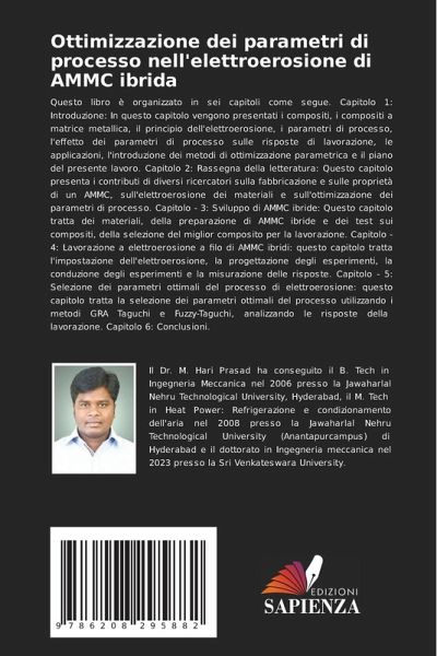 Questo libro è organizzato in sei capitoli come segue. Capitolo 1: Introduzione: In questo capitolo vengono presentati i compositi, i compositi a matrice metallica, il principio dell'elettroerosione, i parametri di processo, l'effetto dei parametri di processo sulle risposte di lavorazione, le applicazioni, l'introduzione dei metodi di ottimizzazione parametrica e il piano del presente lavoro. Capitolo 2: Rassegna della letteratura: Questo capitolo presenta i contributi di diversi ricercatori sulla fabbricazione e sulle proprietà di un AMMC, sull'elettroerosione dei materiali e sull'ottimizzazione dei parametri di processo. Capitolo - 3: Sviluppo di AMMC ibride: Questo capitolo tratta dei materiali, della preparazione di AMMC ibride e dei test sui compositi, della selezione del miglior composito per la lavorazione. Capitolo - 4: Lavorazione a elettroerosione a filo di AMMC ibridi: questo capitolo tratta l'impostazione dell'elettroerosione, la progettazione degli esperimenti, la conduzione degli esperimenti e la misurazione delle risposte. Capitolo - 5: Selezione dei parametri ottimali del processo di elettroerosione: questo capitolo tratta la selezione dei parametri ottimali del processo utilizzando i metodi GRA Taguchi e Fuzzy-Taguchi, analizzando le risposte della lavorazione. Capitolo 6: Conclusioni.