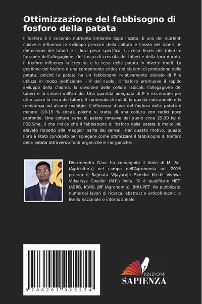 Il fosforo è il secondo nutriente limitante dopo l'azoto. È uno dei nutrienti chiave e influenza lo sviluppo precoce della coltura e l'avvio dei tuberi, le dimensioni dei tuberi e il loro peso specifico. La resa finale dei tuberi è funzione dell'allegagione, del tasso di crescita dei tuberi e della loro durata. Il fosforo influenza la crescita e la resa della patata in diversi modi. La gestione del fosforo è una componente critica nei sistemi di produzione della patata, poiché la patata ha un fabbisogno relativamente elevato di P e utilizza in modo inefficiente il P del suolo. Il fosforo promuove il rapido sviluppo della chioma, la divisione delle cellule radicali, l'allegagione dei tuberi e la sintesi dell'amido. Una quantità adeguata di P è essenziale per ottimizzare la resa dei tuberi, il contenuto di solidi, la qualità nutrizionale e la resistenza ad alcune malattie. L'efficienza d'uso del fosforo della patata è minore (10-15 % circa), poiché si tratta di una coltura con radici poco profonde. Una coltura sana di patate rimuove dal suolo circa 25-30 kg di P2O5/ha, il che indica che il fabbisogno di fosforo della patata è molto più elevato rispetto alla maggior parte dei cereali. Per questo motivo, questo libro è stato concepito per spiegare come ottimizzare il fabbisogno di fosforo della patata attraverso fonti organiche e inorganiche.