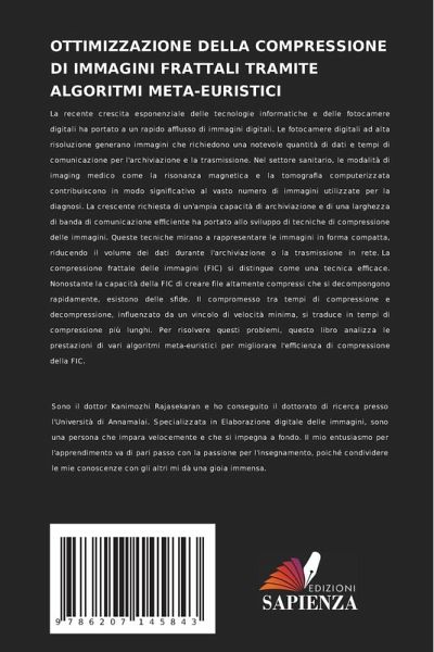 La recente crescita esponenziale delle tecnologie informatiche e delle fotocamere digitali ha portato a un rapido afflusso di immagini digitali. Le fotocamere digitali ad alta risoluzione generano immagini che richiedono una notevole quantità di dati e tempi di comunicazione per l'archiviazione e la trasmissione. Nel settore sanitario, le modalità di imaging medico come la risonanza magnetica e la tomografia computerizzata contribuiscono in modo significativo al vasto numero di immagini utilizzate per la diagnosi. La crescente richiesta di un'ampia capacità di archiviazione e di una larghezza di banda di comunicazione efficiente ha portato allo sviluppo di tecniche di compressione delle immagini. Queste tecniche mirano a rappresentare le immagini in forma compatta, riducendo il volume dei dati durante l'archiviazione o la trasmissione in rete. La compressione frattale delle immagini (FIC) si distingue come una tecnica efficace. Nonostante la capacità della FIC di creare file altamente compressi che si decompongono rapidamente, esistono delle sfide. Il compromesso tra tempi di compressione e decompressione, influenzato da un vincolo di velocità minima, si traduce in tempi di compressione più lunghi. Per risolvere questi problemi, questo libro analizza le prestazioni di vari algoritmi meta-euristici per migliorare l'efficienza di compressione della FIC.