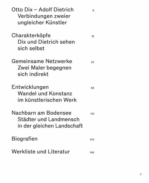 Adolf Dietrich und Otto Dix fanden als Vertreter der Neuen Sachlichkeit zum Erfolg. So verschieden ihr künstlerisches Werk erscheint, so nahe sind sie sich als Vertreter dieser Strömung. Ihre Berührungspunkte finden sich bei Galeristen und Künstlerfreunden, in Museumssammlungen und Gruppenausstellungen. Nachdem die Nationalsozialisten Dix 1933 von seiner Professur an der Kunstakademie Dresden entfernt hatten, ließ er sich nahe der Schweizer Grenze zuerst auf Schloss Randegg, ab 1936 in Hemmenhofen nieder. Durch den Untersee getrennt, lebten er und Dietrich nun in direkter räumlicher Nähe. In den Landschaften der Bodenseegegend fanden die beiden Künstler ihre Motive. Ob sich Dix und Dietrich je besucht haben, ist nicht bekannt, wahrgenommen haben sie sich. So treffen sie in dieser Publikation erstmals aufeinander.