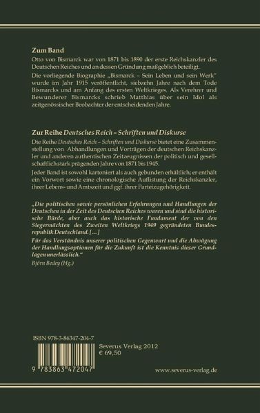 Otto von Bismarck war von 1871 bis 1890 der erste Reichskanzler des Deutschen Reiches und an dessen Gründung maßgeblich beteiligt. Die vorliegende Biographie Bismarck Sein Leben und sein Werk wurde im Jahr 1915 veröffentlicht, siebzehn Jahre nach dem Tode Bismarcks und am Anfang des ersten Weltkrieges. Als Verehrer und Bewunderer Bismarcks schrieb Matthias über sein Idol als zeitgenössischer Beobachter der entscheidenden Jahre.