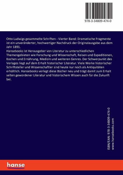 Otto Ludwigs gesammelte Schriften - Vierter Band: Dramatische Fragmente ist ein unveränderter, hochwertiger Nachdruck der Originalausgabe aus dem Jahr 1891.Hansebooks ist Herausgeber von Literatur zu unterschiedlichen Themengebieten wie Forschung und Wissenschaft, Reisen und Expeditionen, Kochen und Ernährung, Medizin und weiteren Genres. Der Schwerpunkt des Verlages liegt auf dem Erhalt historischer Literatur. Viele Werke historischer Schriftsteller und Wissenschaftler sind heute nur noch als Antiquitäten erhältlich. Hansebooks verlegt diese Bücher neu und trägt damit zum Erhalt selten gewordener Literatur und historischem Wissen auch für die Zukunft bei.