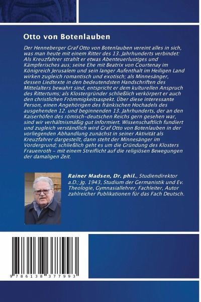 Der Henneberger Graf Otto von Botenlauben vereint alles in sich, was man heute mit einem Ritter des 13. Jahrhunderts verbindet: Als Kreuzfahrer strahlt er etwas Abenteuerlustiges und Kämpferisches aus; seine Ehe mit Beatrix von Courtenay im Königreich Jerusalem und sein langer Aufenthalt im Heiligen Land wirken zugleich romantisch und exotisch; als Minnesänger, dessen Liedtexte in den bedeutendsten Handschriften des Mittelalters bewahrt sind, entspricht er dem kulturellen Anspruch des Rittertums; als Klostergründer schließlich verkörpert er auch den christlichen Frömmigkeitsaspekt. Über diese interessante Person, einen Angehörigen des fränkischen Hochadels des ausgehenden 12. und beginnenden 13. Jahrhunderts, der an den Kaiserhöfen des römisch-deutschen Reichs gern gesehen war, sind wir verhältnismäßig gut informiert. Wissenschaftlich fundiert und zugleich verständlich wird Graf Otto von Botenlauben in der vorliegenden Abhandlung zunächst in seiner Aktivität als Kreuzfahrer dargestellt, dann steht der Minnesänger im Vordergrund; schließlich geht es um die Gründung des Klosters Frauenroth - mit einem Streiflicht auf die religiösen Bewegungen der damaligen Zeit.