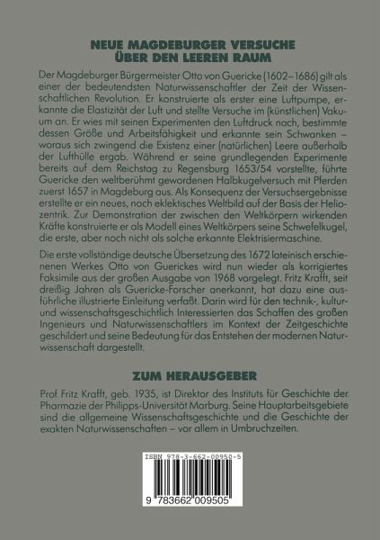 Die erste vollständige deutsche Übersetzung des 1672 lateinisch erschienenen Werkes Otto von Guerickes ist nun als korrigiertes Faksimile aus der großen Ausgabe von 1968 wieder verfügbar. Fritz Krafft, seit dreißig Jahren als Guericke-Forscher anerkannt, hat dazu eine ausführliche illustrierte Einleitung verfaßt. Darin wird für den technik-, kultur- und wissenschaftsgeschichtlich Interessierten das Schaffen des großen Ingenieurs und Naturwissenschaftlers im Kontext der Zeitgeschichte geschildert und seine Bedeutung für das Entstehen der modernen Naturwissenschaft dargestellt.