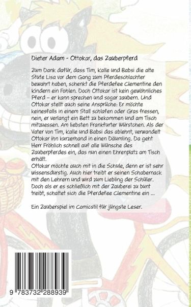 Zum Dank dafür, dass Tim, Kalle und Babsi die alte Stute Lisa vor dem Gang zum Pferdeschlachter bewahrt haben, schenkt die Pferdefee Clementine den Kindern ein Fohlen. Doch Ottokar ist kein gewöhnliches Pferd - er kann sprechen und sogar zaubern. Und Ottokar stellt auch seine Ansprüche: Er möchte keinesfalls in einem Stall schlafen oder Gras fressen, nein, er verlangt ein Bett zu bekommen und am Tisch mitzuessen. Am liebsten Frankfurter Würstchen. Als der Vater von Tim, Kalle und Babsi das ablehnt, verwandelt Ottokar ihn kurzerhand in einen Däumling. Da geht Herr Fröhlich schnell auf alle Wünsche des Zauberpferdes ein, das nun einen Ehrenplatz am Tisch erhält.Ottokar möchte auch mit in die Schule, denn er ist sehr wissensdurstig. Auch hier treibt er seinen Schabernack mit den Lehrern und wird zum Liebling der Schüler. Doch als er es schließlich mit der Zauberei zu bunt treibt, schaltet sich die Pferdefee Clementine ein ...Ein Zauberspiel von Dieter Adam im Comicstil für jüngste Leser.