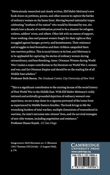 During war time, the everyday experiences of ordinary people - and especially women - are frequently obscured by elite military and social analysis. In this pioneering study, Elif Mahir Metinsoy focuses on the lives of ordinary Muslim women living in the Ottoman Empire during the First World War. It reveals not only their wartime problems, but also those of everyday life on the Ottoman home front. It questions the existing literature's excessive focus on the Ottoman middle-class, using new archive sources such as women's petitions to extend the scope of Ottoman-Turkish women's history. Free from academic jargon, and supported by original illustrations and maps, it will appeal to researchers of gender history, Middle Eastern and social history. By showing women's resistance to war mobilization, wartime work life and the everyday struggles which shaped state politics, Mahir Metinsoy allows readers to draw intriguing comparisons between the past and the current events of today's Middle East.