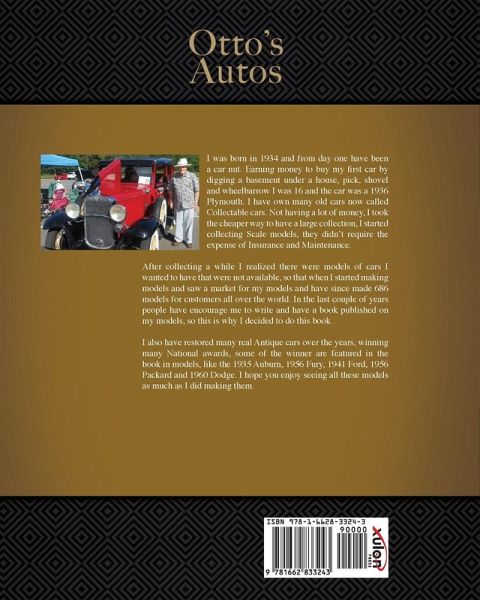 I was born in 1934 and from day one have been a car nut. Earning money to buy my first car by digging a basement under a house, pick, shovel and wheelbarrow I was 16 and the car was a 1936 Plymouth. I have own many old cars now called Collectable cars. Not having a lot of money, I took the cheaper way to have a large collection, I started collecting Scale models, they didn't require the expense of Insurance and Maintenance. After collecting a while I realized there were models of cars I wanted to have that were not available, so that when I started making models and saw a market for my models and have since made 686 models for customers all over the world. In the last couple of years people have encourage me to write and have a book published on my models, so this is why I decided to do this book. I also have restored many real Antique cars over the years, winning many National awards, some of the winner are featured in the book in models, like the 1935 Auburn, 1956 Fury, 1941 Ford, 1956 Packard and 1960 Dodge. I hope you enjoy seeing all these models as much as I did making them.
