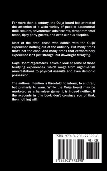 Think the Ouija board is just a game? Think again. For more than a century the Ouija board has attracted the attention of a wide variety of people: paranormal thrill-seekers, adventurous adolescents, temperamental teens, tipsy party guests, and even curious skeptics. Most of the time, those who dabble with the Ouija or other spirit boards experience nothing out of the ordinary. But many times that's not the case. And many times that extraordinary experience isn't just strange, but downright terrifying. Ouija Board Nightmares takes a look at some of those terrifying experiences, which range from nightmarish manifestations to actual physical assaults and demonic possession. While part of the author's intention is to inform and engage with these scary accounts, the main objective is to warn. While the Ouija board may be marketed as a harmless game, it is indeed neither. If the accounts in this book don't convince you of that, then nothing will.