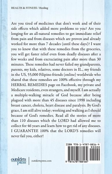 Are you tired of medicines that don't work and of their side effects which added more problems to you? Are you longing for an all-natural remedies to get immediate relief from pain and from diseases which are proven and already worked for more than 7 decades (until these days)? I want you to know that with these remedies from the groceries, you will get faster relief even from deadly diseases after few weeks and from excruciating pain after more than 30 minutes. These remedies never failed my grandparents, parents, my kids, relatives, some doctors in IL., my friends in the US, 55,000 Filipino friends (online) worldwide who shared that these remedies are 100% effective through Herbal Remedies page on Facebook, my private and Medicare residents, even strangers, and myself. I am actually a walking miracle of God because after plagued with more than 45 diseases since 1998 including breast cancer, cholera, heart disease and paralysis. By God's grace, I am still alive today; working and walking as I should because of God's creations/remedies. Read all the stories of more than 90 diseases which the LORD allowed me to collect for 46 years and learn how to get rid of any diseases. I GUARANTEE 100% that the LORD'S remedies will never fail you, either!