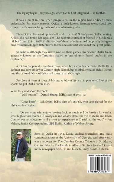 The legacy began 100 years ago, when Ocilla beat Fitzgerald ... in football! It was a point in time when progressives in the region had drubbed Ocilla industrially. For many reasons, Ocilla, a little-known farming town, could not compete with anyone for growth and manufacturing jobs. Then Ocilla Hi started up football, and ... wham! Nobody saw Ocilla coming. At last, she had found her equalizer. The economic impact of football in Ocilla was nil, but from 1923 to 1928, the little school's band of outmanned but plucky lads gave boys from these bigger, faster towns the business in what was called the "great game." Somehow, although they never won all their games, the "clean" Ocilla team, generally known as the Terrapins, hailed as one of most feared outfits in the conference. A lot has happened since those days, when boys wore leather hats. Ocilla Hi is defunct and now it's Irwin County High School, but football remains richly woven into the cultural fabric of this small town in rural Georgia. Our Boys A team. A town. A history. A Way of life is an impassioned look at the sport that put Ocilla on the map. What they said about the book: - "Well written" - Derrell Young, ICHS class of 1971-72 - "Great book" - Jack Smith, ICHS class of 1965-66, who later played for the Philadelphia Eagles. - "As someone who enjoys looking back as much as I do looking forward at what high school football in Georgia is and what will be, this trip to Ocilla and Irwin County was an education and a treat to experience as David led the tour." - Jon Nelson, Senior Correspondent, GPB Radio, Author of Nobles Strong.