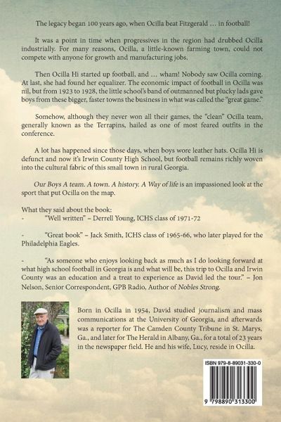 The legacy began 100 years ago, when Ocilla beat Fitzgerald ... in football! It was a point in time when progressives in the region had drubbed Ocilla industrially. For many reasons, Ocilla, a little-known farming town, could not compete with anyone for growth and manufacturing jobs. Then Ocilla Hi started up football, and ... wham! Nobody saw Ocilla coming. At last, she had found her equalizer. The economic impact of football in Ocilla was nil, but from 1923 to 1928, the little school's band of outmanned but plucky lads gave boys from these bigger, faster towns the business in what was called the "great game." Somehow, although they never won all their games, the "clean" Ocilla team, generally known as the Terrapins, hailed as one of most feared outfits in the conference. A lot has happened since those days, when boys wore leather hats. Ocilla Hi is defunct and now it's Irwin County High School, but football remains richly woven into the cultural fabric of this small town in rural Georgia. Our Boys A team. A town. A history. A Way of life is an impassioned look at the sport that put Ocilla on the map. What they said about the book: - "Well written" - Derrell Young, ICHS class of 1971-72 - "Great book" - Jack Smith, ICHS class of 1965-66, who later played for the Philadelphia Eagles. - "As someone who enjoys looking back as much as I do looking forward at what high school football in Georgia is and what will be, this trip to Ocilla and Irwin County was an education and a treat to experience as David led the tour." - Jon Nelson, Senior Correspondent, GPB Radio, Author of Nobles Strong.