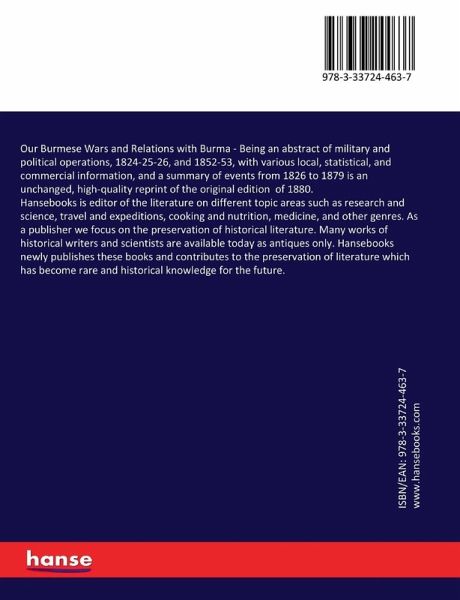 Our Burmese Wars and Relations with Burma - Being an abstract of military and political operations, 1824-25-26, and 1852-53, with various local, statistical, and commercial information, and a summary of events from 1826 to 1879 is an unchanged, high-quality reprint of the original edition of 1880.Hansebooks is editor of the literature on different topic areas such as research and science, travel and expeditions, cooking and nutrition, medicine, and other genres. As a publisher we focus on the preservation of historical literature. Many works of historical writers and scientists are available today as antiques only. Hansebooks newly publishes these books and contributes to the preservation of literature which has become rare and historical knowledge for the future.