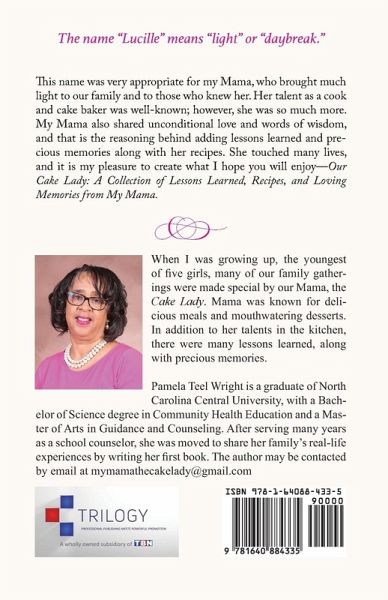 The name "Lucille" means "light" or "daybreak." This name was very appropriate for my Mama, who brought much light to our family and to those who knew her. Her talent as a cook and cake baker was well-known; however, she was so much more. My Mama also shared unconditional love and words of wisdom, and that is the reasoning behind adding lessons learned and precious memories along with her recipes. She touched many lives, and it is my pleasure to create what I hope you will enjoy--Our Cake Lady: A Collection of Lessons Learned, Recipes, and Loving Memories from My Mama.