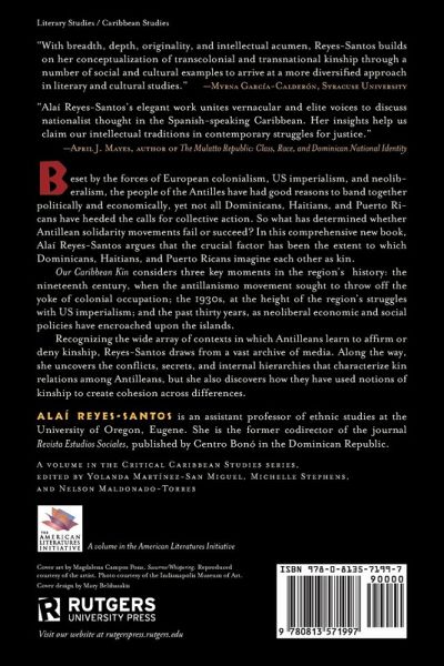 Beset by the forces of European colonialism, US imperialism, and neoliberalism, the people of the Antilles have had good reasons to band together politically and economically, yet not all Dominicans, Haitians, and Puerto Ricans have heeded the calls for collective action. So what has determined whether Antillean solidarity movements fail or succeed? In this comprehensive new study, AlaÍ Reyes-Santos argues that the crucial factor has been the extent to which Dominicans, Haitians, and Puerto Ricans imagine each other as kin. Our Caribbean Kin considers three key moments in the region’s history: the nineteenth century, when the antillanismo movement sought to throw off the yoke of colonial occupation; the 1930s, at the height of the region’s struggles with US imperialism; and the past thirty years, as neoliberal economic and social policies have encroached upon the islands. At each moment, the book demonstrates, specific tropes of brotherhood, marriage, and lineage have been mobilized to construct political kinship among Antilleans, while racist and xenophobic discourses have made it difficult for them to imagine themselves as part of one big family. Recognizing the wide array of contexts in which Antilleans learn to affirm or deny kinship, Reyes-Santos draws from a vast archive of media, including everything from canonical novels to political tracts, historical newspapers to online forums, sociological texts to local jokes. Along the way, she uncovers the conflicts, secrets, and internal hierarchies that characterize kin relations among Antilleans, but she also discovers how they have used notions of kinship to create cohesion across differences.