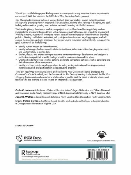 What if you could challenge your kindergartners to come up with a way to reduce human impact on the environment? With this volume in the STEM Road Map Curriculum Series, you can! Our Changing Environment outlines a journey that will steer your students toward authentic problem solving while grounding them in integrated STEM disciplines. Like the other volumes in the series, this book is designed to meet the growing need to infuse real-world learning into K-12 classrooms. This interdisciplinary, three-lesson module uses project- and problem-based learning to help students investigate the environment around them, with a focus on ways that humans can impact the environment. Working in teams, students will investigate various types of human impact on the environment (including pollution, littering, and habitat destruction), will participate in a classroom recycling program, and will explore the engineering design process as they devise ways to repurpose waste materials. To support this goal, students will do the following: Identify human impacts on the environment. Identify technological advances and tools that scientists use to learn about the changing environment, and use technology to gather data. Explain, discuss, and express concepts about the environment through development and design of a publication to report their scientific findings about the environment around the school. Chart and understand local weather patterns, and make connections between weather conditions and their observations of the environment. Identify and demonstrate recycling practices, including sorting materials and tracking amounts of materials recycled, and participate in a class recycling program. The STEM Road Map Curriculum Series is anchored in the Next Generation Science Standards, the Common Core State Standards, and the Framework for 21st Century Learning. In-depth and flexible, Our Changing Environment can be used as a whole unit or in part to meet the needs of districts, schools, and teachers who are charting a course toward an integrated STEM approach.