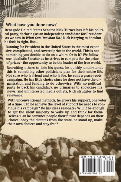 What have you done now? Renegade United States Senator Nick Turner has left his political party, declaring as an independent candidate for President. As we saw in What Can One Man Do?, Nick is trying to do what he feels is right. But... Running for President in the United States is the most expensive, complicated, and coveted prize in the world. This is not something you decide to do on a whim. Or is it? In this book, we follow our idealistic Senator as he strives to compete for the prize of prizes - the opportunity to be the leader of the free world. Recruiting others to join his Quixotic quest, he quickly understands this is something other politicians plan for their entire career. Not sure who is friend and who is foe, he runs a grass-roots campaign, feeling this is the path to the people. There is also little choice since he does not have the organization and funding to do otherwise. With no political party to back his candidacy, no primaries to showcase his views, and uninterested media outlets, Nick struggles to find relevance. With unconventional methods, Nick grows his support, one voter at a time, always seeking to stay below the radar. Mainly, he strives to avoid attracting the attention of Alexis 'Lexi' Smythe-Thomas, the sitting Vice President and presumed winner of the upcoming election. Can Nick achieve the level of support he needs to continue his campaign? Do his ideas resonate? Will it be enough to get the silent majority to wake up and think for themselves? Is there truly a silent majority, ready to be roused, or are we already too apathetic to care? Can Nick convince people their future depends on their choice: to obey or to stand up and stay free?