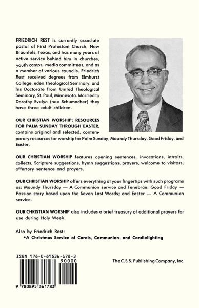 Our Christian Worship: Resources For Palm Sunday Through Easter, contains original and selected, contemporary resources for worship for Palm Sunday, Maundy Thursday, Good Friday, and Easter. Our Christian Worship features opening sentences, invocations, introits, collects, Scripture suggestions, hymn suggestions, prayers, welcome to visitors, offertory sentence, and prayers. Our Christian Worship offers everything at your fingertips with such programs as: Maundy Thursday -- A Communion service and Tenebrae; Good Friday -- Passion story based upon the Seven Last Words; and Easter -- A Communion service. Our Christian Worship also includes a brief treasury of additional prayers for use during Holy Week. Friedrich Rest is currently associate pastor of First Protestant Church, New Braunfels, Texas, and has many years of active service behind him in churches, youth camps, media committees, and as a member of various councils. Friedrich Rest received degrees from Elmhurst College, Eden Theological Seminary, and his Doctorate from United Theological Seminary, St. Paul, Minnesota. Married to Dorothy Evelyn (nee Schumacher) they have three adult children.