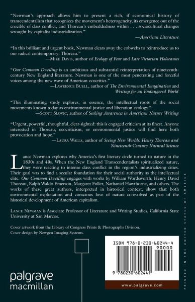 OurCommonDwelling explores why America's first literary circle turned to nature in the 1830s and '40s. When the New England Transcendentalists spiritualized nature, they were reacting to intense class conflict in the region's industrializing cities. Their goal was to find a secular foundation for their social authority as an intellectual elite. New England Transcendentalism engages with works by William Wordsworth, Henry David Thoreau, Ralph Waldo Emerson, Margaret Fuller, Nathaniel Hawthorne, and others. The works of these great authors, interpreted in historical context, show that both environmental exploitation and conscious love of nature co-evolved as part of the historical development of American capitalism.
