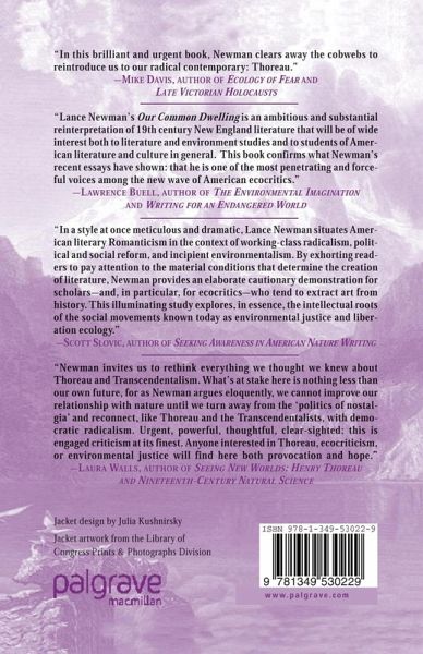 OurCommonDwelling explores why America's first literary circle turned to nature in the 1830s and '40s. When the New England Transcendentalists spiritualized nature, they were reacting to intense class conflict in the region's industrializing cities. Their goal was to find a secular foundation for their social authority as an intellectual elite. New England Transcendentalism engages with works by William Wordsworth, Henry David Thoreau, Ralph Waldo Emerson, Margaret Fuller, Nathaniel Hawthorne, and others. The works of these great authors, interpreted in historical context, show that both environmental exploitation and conscious love of nature co-evolved as part of the historical development of American capitalism.