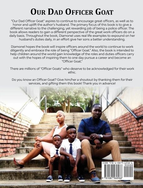 "Our Dad Officer Goat" aspires to continue to encourage great officers, as well as to honor and uplift the author's husband. The primary focus of this book is to give a different narrative to the challenging, yet rewarding job of being a police officer. The book allows readers to gain a different perspective of the great work officers do on a daily basis. Throughout the book, Diamonel uses real-life examples to expound on her husband's duties daily, in an effort give her sons a better understanding. Diamonel hopes the book will inspire officers around the world to continue to work diligently and embrace the role of being "Officer Goat". Also, the book is intended to help children around the world to gain knowledge of the roles and duties officers carry out with the hopes of inspiring them to one day pursue a career and become an "Officer Goat." There are millions of "Officer Goats" who deserve to be acknowledged for their work ethic. Do you know an Officer Goat? Give him/her a shoutout by thanking them for their services, and gifting them this book! Thank you in advance!