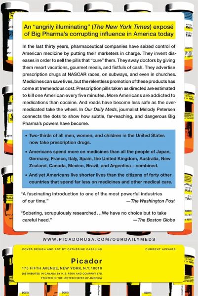 An "angrily illuminating" (The New York Times) exposé of Big Pharma's corrupting influence in America today In the last thirty years, pharmaceutical companies have seized control of American medicine by putting their marketers in charge. They invent diseases in order to sell the pills that "cure" them. They sway doctors by giving them resort vacatopms, gourmet meals, and fistfuls of cash. They advertise prescription drugs at NASCAR races, on subways, and even in churches. Medicines can save lives, but the relentless promotion of these products has come at tremendous cost. Prescription pills taken as directed are estimated to kill one American every five minutes. More Americans are addicted to medications than cocaine. And roads have become less safe as the over-medicated take to the wheel. In Our Daily Meds, journalist Melody Petersen connects the dots to show how subtle, far-reaching, and dangerous Big Pharma's powers have become.