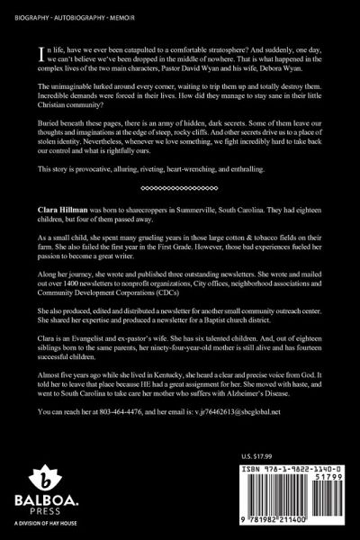 In life, have we ever been catapulted to a comfortable stratosphere? And suddenly, one day, we cant believe weve been dropped in the middle of nowhere. That is what happened in the complex lives of the two main characters, Pastor David Wyan and his wife, Debora Wyan. The unimaginable lurked around every corner, waiting to trip them up and totally destroy them. Incredible demands were forced in their lives. How did they manage to stay sane in their little Christian community? Buried beneath these pages, there is an army of hidden, dark secrets. Some of them leave our thoughts and imaginations at the edge of steep, rocky cliffs. And other secrets drive us to a place of stolen identity. Nevertheless, whenever we love something, we fight incredibly hard to take back our control and what is rightfully ours. This story is provocative, alluring, riveting, heart-wrenching, and enthralling.