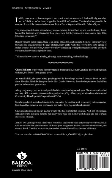 In life, have we ever been catapulted to a comfortable stratosphere? And suddenly, one day, we cant believe weve been dropped in the middle of nowhere. That is what happened in the complex lives of the two main characters, Pastor David Wyan and his wife, Debora Wyan. The unimaginable lurked around every corner, waiting to trip them up and totally destroy them. Incredible demands were forced in their lives. How did they manage to stay sane in their little Christian community? Buried beneath these pages, there is an army of hidden, dark secrets. Some of them leave our thoughts and imaginations at the edge of steep, rocky cliffs. And other secrets drive us to a place of stolen identity. Nevertheless, whenever we love something, we fight incredibly hard to take back our control and what is rightfully ours. This story is provocative, alluring, riveting, heart-wrenching, and enthralling.