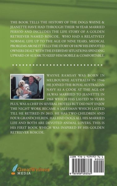 THE BOOK TELLS THE HISTORY OF THE DOGS WAYNE & JEANETTE HAVE HAD THROUGH THEIR 50-YEAR MARRIED PERIOD AND INCLUDES THE LIFE STORY OF A GOLDEN RETRIEVER NAMED ROSCOE. WHO HAD A RELATIVELY NORMAL LIFE UP TO THE AGE OF NINE YEARS. MEDICAL PROBLEMS AROSE IT TELLS THE STORY OF HOW HIS DEVOTED OWNERS DEALT WITH THE EVERYDAY SITUATIONS SPENDINGUPWARD OF AU$30K TO KEEP HIM MOBILE & COMFORTABLE.