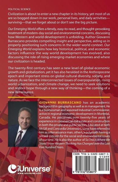 Civilization is about to enter a new chapter in its history, yet most of us are so bogged down in our work, personal lives, and daily activities-surviving-that we forget about or don't see the big picture. Our Emerging World offers a timely, easy-to-read, and thought-provoking treatment of modern-day social and environmental concerns, discussing how Western and world development is unfolding. Author Giovanni Burrascano provides compelling insight and perspective, aiding us in properly positioning such concerns in the wider world context. Our Emerging World explains how key historical, political, and economic factors influence the way world development has evolved, also discussing the role of rising emerging-market economies and where our civilization is headed. The twenty-first century has seen a new level of global economic growth and globalization, yet it has also heralded in the Anthropocene epoch and important stress on global cultural diversity, society, and nature. As we face the interconnected issues of overpopulation, rising world urbanization, and climate change, we need to seek solutions and restore hope through a new way of thinking-the coming of a new Renaissance.