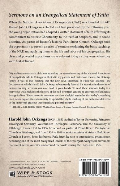 Sermons on an Evangelical Statement of Faith When the National Association of Evangelicals (NAE) was founded in 1942, Harold John Ockenga was elected as it first president. By the following year, the young organization had adopted a written statement of faith affirming its commitment to historic Christianity, to the truth of Scripture, and to sound doctrine. As pastor of Boston's historic Park Street Church, Ockenga took the opportunity to preach a series of sermons explaining the basic teachings of the NAE and applying them to the life and labors of his congregation. His clear and powerful expositions are as relevant today as they were when they were first delivered.
