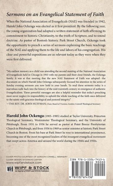 Sermons on an Evangelical Statement of Faith When the National Association of Evangelicals (NAE) was founded in 1942, Harold John Ockenga was elected as it first president. By the following year, the young organization had adopted a written statement of faith affirming its commitment to historic Christianity, to the truth of Scripture, and to sound doctrine. As pastor of Boston's historic Park Street Church, Ockenga took the opportunity to preach a series of sermons explaining the basic teachings of the NAE and applying them to the life and labors of his congregation. His clear and powerful expositions are as relevant today as they were when they were first delivered.