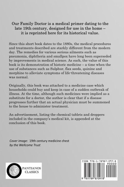 Our Family Doctor is a medical primer dating to the late 19th century, designed for use in the home - it is reprinted here for its historical value. Since this short book dates to the 1880s, the medical procedures and treatments described are starkly different from the modern day. The remedies for various serious ailments such as pneumonia, diphtheria and smallpox have long been superseded by improvements in medical science. As such, the value of this book is its demonstration of historic medicine - a time when the use of substances such as Sulphur, flax seeds, quinine and morphine to alleviate symptoms of life-threatening diseases was normal. Originally, this book was attached to a medicine case which households could buy and keep in case of a sudden outbreak of illness. At the time, although such medicines were implied as a substitute for a doctor, the author is clear that if a disease progresses further that an actual physician must be summoned to the house to administer treatment. An advertisement, listing the chemical tablets and droppers included in the company's medical kit, is appended at the conclusion of this book.
