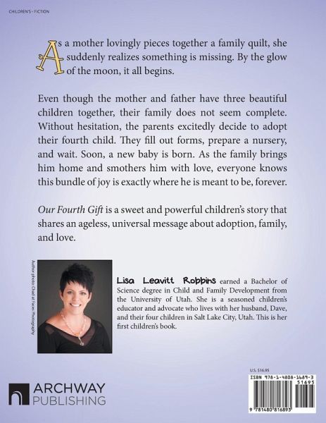 As a mother lovingly pieces together a family quilt, she suddenly realizes something is missing. By the glow of the moon, it all begins. Even though the mother and father have three beautiful children together, their family does not seem complete. Without hesitation, the parents excitedly decide to adopt their fourth child. They fill out forms, prepare a nursery, and wait. Soon, a new baby is born. As the family brings him home and smothers him with love, everyone knows this bundle of joy is exactly where he is meant to be, forever. Our Fourth Gift is a sweet and powerful children's story that shares an ageless, universal message about adoption, family, and love.