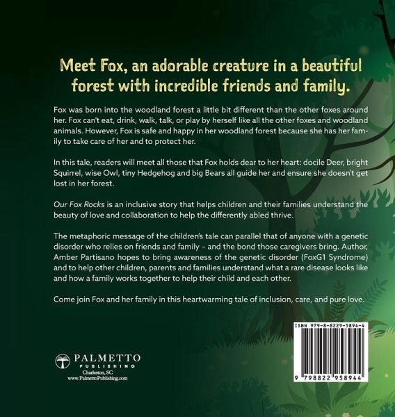 Teach children about the difference in others, especially those with different ables and needs, through the heartwarming story of Fox and the friends and family who help her thrive. Meet Fox, an adorable creature in a beautiful forest with incredible friends and family. Fox was born into the woodland forest a little bit different than the other foxes around her. Fox can't eat, drink, walk, talk, or play by herself like all the other foxes and woodland animals. However, Fox is safe and happy in her woodland forest because she has her family to take care of her and protect her. In the tale, readers will meet all those that Fox holds dear to her heart: docile Deer, bright Squirrel, wise Owl, tiny Hedgehog and big Bears all guide her and ensure she doesn't get lost in her forest. Our Fox Rocks is an inclusive story that helps children and their families understand the beauty of love and collaboration to help the differently abled thrive. The metaphoric message of the children's tale can parallel that of anyone with a rare genetic disorder who relies on the friends and family - and the bond those caregivers bring. Author Amber Partisano hopes to bring awareness of the rare genetic disorder - FOXG1 Syndrome, and to help other children, parents and families understand what a rare disease looks like and how a family works together to help their child and each other. Come join Fox and her family in this heartwarming tale of inclusion, care, and pure love.