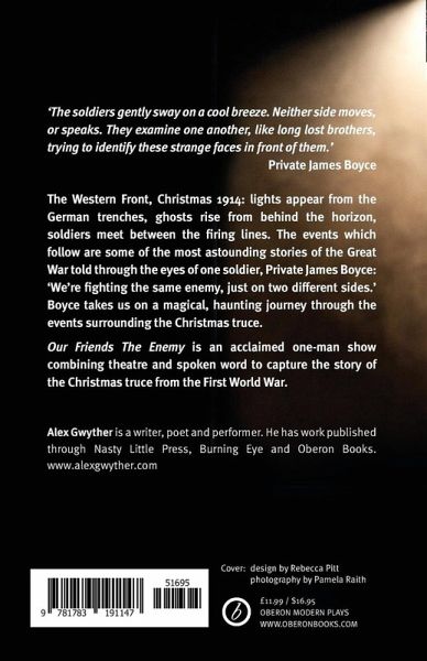 The Western Front, Christmas 1914: lights appear from the German trenches, ghosts rise behind the horizon, soldiers meet between the firing lines. The events which follow are the most astounding stories of the Great War told through the eyes of one soldier, Private James Boyce: 'We're fighting the same enemy, just on two different sides.' Boyce takes us on a magical, haunting journey through the events surrounding the Christmas truce. Our Friends, The Enemy is a debut solo show combining theatre and spoken word to tell the story of the Christmas truce from the First World War.