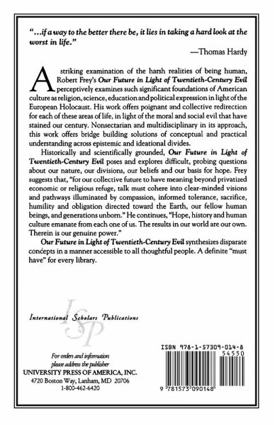 A striking exmination of the harsh relities of being human, Robert Frey's Our Future in Light of Twentieth-Century Evil perceptively examines such significant foundations of American culture as religion, science, education and political experession i light fo the European Holocaust. His work offers poignant and collective re-direction for each of these areas of life, in light of the moral and social evil that have stained our century. Non-sectarian and multidisciplinary in its approach, this work offers bridge buidingg solutions of conceptual and practical understanding across epistemic and ideational divides. Historically and scientifically gorunded, Our Future in Light of Twentieth-Century Evil poses and explores difficult, probing questions about our nature, our divisions, our beliefs and our basis for hope. Frey suggests that, "for our collectives future to have meaning beyond privatized economic or religious refuge, talk must cohere into clear-minded visions and pathways illuminated by compassion, informed tolerance, sacrifice, humility and obligation directed toward the Earth, our fellow human beings, and generations unborn." He continues, "Hope, history and human culture emanate from each one of us. The results in our world are our own. Therein is our genuine power." Our Future in Light of Twentieth-Century Evil synthesizes disparate concepts in a manner accessible to all thoughtful people. A definite "must have" for every library.