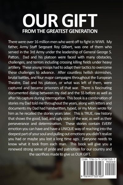 Our Gift: A Journey of Sacrifice, Survival, and the Legacy of a Generation In Our Gift, Robert Gilbert takes readers through the captivating and poignant memories of his father, Roy Gilbert, a WWII sergeant who fought courageously under General George S. Patton. From the brutal realities of war to unimaginable moments of faith and resilience, Roy's story weaves through battles, survival against overwhelming odds, and his enduring commitment to his community after returning home. This book is not just a tribute to one man but to the entire Greatest Generation, who fought to protect the liberties we hold dear. Explore stories of heroism, devotion, and the extraordinary events that shaped Roy's life and the lives of countless veterans. Through his father's experiences, Robert Gilbert honors a legacy of courage, preserving these tales for future generations to appreciate the sacrifices that granted us our freedom-Our Gift.