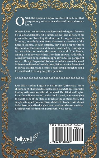 Erin Ellis studies English at Dalhousie University. Since childhood she has been fascinated with storytelling, eventually leading to the creation of her debut novel, Our Glorious Empire. Erin adores literature and reads a book a week, always enjoying the aesthetics of the style as much as the content itself. The simple yet elegant prose of classic children's literature will always be her favorite and is what she tries to emulate in her own writing. Erin lives with her family in Dartmouth, Nova Scotia.