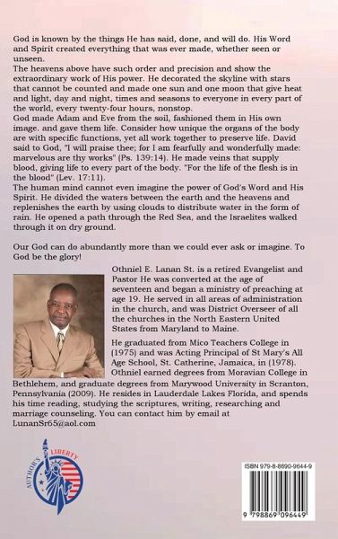God is known by the things He has said, done, and will do. His Word and Spirit created everything that was ever made, whether seen or unseen. The heavens above have such order and precision and show the extraordinary work of His power. He decorated the skyline with stars that cannot be counted and made one sun and one moon that give heat and light, day and night, times and seasons to everyone in every part of the world, every twenty-four hours, nonstop. God made Adam and Eve from the soil, fashioned them in His own image, and gave them life. Consider how unique the organs of the body are with specific functions, yet all work together to preserve life. David said to God, "I will praise thee; for I am fearfully and wonderfully made: marvelous are thy works" (Ps. 139:14). He made veins that supply blood, giving life to every part of the body. "For the life of the flesh is in the blood" (Lev. 17:11). The human mind cannot even imagine the power of God's Word and His Spirit. He divided the waters between the earth and the heavens and replenishes the earth by using clouds to distribute water in the form of rain. He opened a path through the Red Sea, and the Israelites walked through it on dry ground. Our God can do abundantly more than we could ever ask or imagine. To God be the glory! Othniel E. Lunan Sr. is a retired Evangelist and Pastor. He was converted at the age of seventeen and began a ministry of preaching at age 19. He served in all areas of administration in the church, and was District Overseer of all the churches in the North Eastern United States from Maryland to Maine. He graduated from Mico Teachers College in (1975) and was Acting Principal of St Mary's All Age School, St. Catherine, Jamaica, in (1978). Othniel earned degrees from Moravian College in Bethlehem, and graduate degrees from Marywood University in Scranton, Pennsylvania (2009). He resides in Lauderdale Lakes Florida, and spends his time reading, studying the scriptures, writing, researching and marriage counseling. You can contact him by email at LunanSr65@aol.com