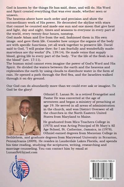 God is known by the things He has said, done, and will do. His Word and Spirit created everything that was ever made, whether seen or unseen. The heavens above have such order and precision and show the extraordinary work of His power. He decorated the skyline with stars that cannot be counted and made one sun and one moon that give heat and light, day and night, times and seasons to everyone in every part of the world, every twenty-four hours, nonstop. God made Adam and Eve from the soil, fashioned them in His own image, and gave them life. Consider how unique the organs of the body are with specific functions, yet all work together to preserve life. David said to God, "I will praise thee; for I am fearfully and wonderfully made: marvelous are thy works" (Ps. 139:14). He made veins that supply blood, giving life to every part of the body. "For the life of the flesh is in the blood" (Lev. 17:11). The human mind cannot even imagine the power of God's Word and His Spirit. He divided the waters between the earth and the heavens and replenishes the earth by using clouds to distribute water in the form of rain. He opened a path through the Red Sea, and the Israelites walked through it on dry ground. Our God can do abundantly more than we could ever ask or imagine. To God be the glory! Othniel E. Lunan Sr. is a retired Evangelist and Pastor. He was converted at the age of seventeen and began a ministry of preaching at age 19. He served in all areas of administration in the church, and was District Overseer of all the churches in the North Eastern United States from Maryland to Maine. He graduated from Mico Teachers College in (1975) and was Acting Principal of St Mary's All Age School, St. Catherine, Jamaica, in (1978). Othniel earned degrees from Moravian College in Bethlehem, and graduate degrees from Marywood University in Scranton, Pennsylvania (2009). He resides in Lauderdale Lakes Florida, and spends his time reading, studying the scriptures, writing, researching and marriage counseling. You can contact him by email at LunanSr65@aol.com