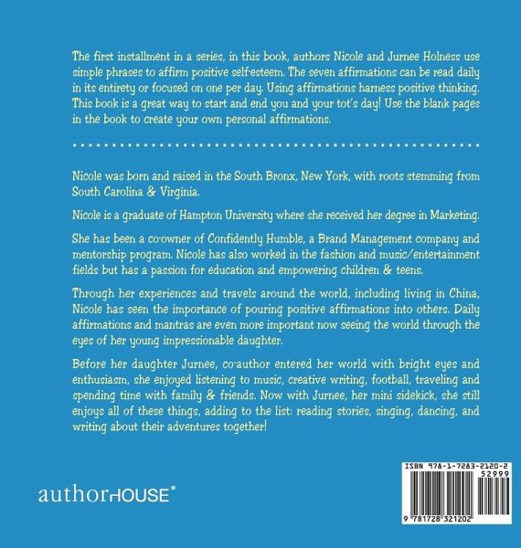 The first installment in a series, in this book, authors Nicole and Jurnee Holness use simple phrases to affirm positive self-esteem. The seven affirmations can be read daily in its entirety or focused on one per day. Using affirmations harness positive thinking. This book is a great way to start and end you and your tot's day! Use the blank pages in the book to create your own personal affirmations.