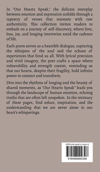 In "Our Hearts Speak," the delicate interplay between emotion and expression unfolds through a tapestry of verses that resonate with raw authenticity. This collection invites readers to embark on a journey of self-discovery, where love, loss, joy, and longing intertwine amid the cadence of life. Each poem serves as a heartfelt dialogue, capturing the whispers of the soul and the echoes of experiences that bind us all. With lyrical precision and vivid imagery, the poet crafts a space where vulnerability and strength coexist, reminding us that our hearts, despite their fragility, hold infinite power to connect and transform. Dive into the rhythms of longing and the beauty of shared moments, as "Our Hearts Speak" leads you through the landscape of human emotion, echoing truths that are often left unspoken. In the intimacy of these pages, find solace, inspiration, and the understanding that we are never alone in our heart's whisperings.
