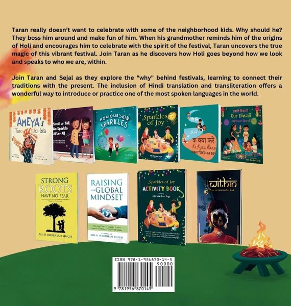 This is a story about raising confidence, the joy of togetherness and fighting colorism. The story - Taran doesn't want to play Holi with the kids in his neighborhood. They boss him around. They make fun of him. It's not a great feeling to be picked on. Why then does his grandmother ask him to celebrate the Holi festival with them? In this book Our Holi, you see that Taran see the ways in which the festival brings meaning into our daily lives. Giving one confidence and bringing people closer, friends and foe is what Holi is all about. Join Taran as he discovers why Holi belongs to everyone, no matter who they are. The Hindi translation and English transliteration are a great way to practice and comprehend one of the most spoken languages in the world.