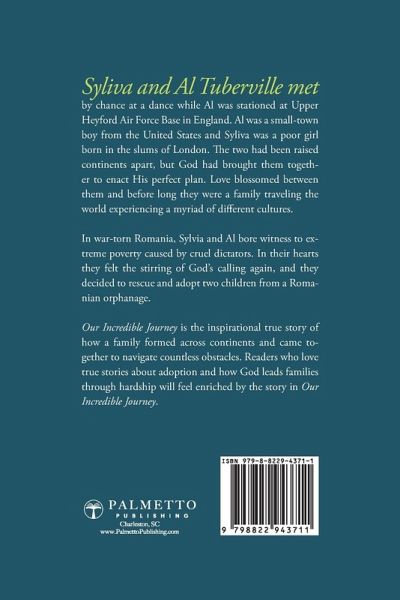 Experience an extraordinary story of faith that brought a family together across continents and rejoice with them as God leads them through obstacle after obstacle according to His perfect plan. Sylvia and Al Tuberville first met by chance at a dance. The two had been born continents apart, but their stories were destined to collide and merge, according to God's incredible plan for their lives. Al was a small-town, kind, gentle country boy currently stationed at the Upper Heyford Force Base in England and Sylvia was a poor girl born in the slums of England. Their first meeting was a brief encounter that turned out to be a major step into the next dramatic chapter of their lives. Love blossomed and Sylvia and Al became a family that traveled the world. Learning and growing amid cultures far from home, Sylvia and Al discovered the next major step in God's plan in war-torn Romania. Bearing witness to extreme poverty caused by cruel dictators, Sylvia and Al decided to become part of the solution and rescued and adopted two children from an orphanage. Our Incredible Journey shares how a family came together against all odds. Readers will rejoice with them as God leads them through obstacle after obstacle, steering them to His perfect plan. Our Incredible Journey aims to build up faith in all its readers, reminding them that God is always in the details.